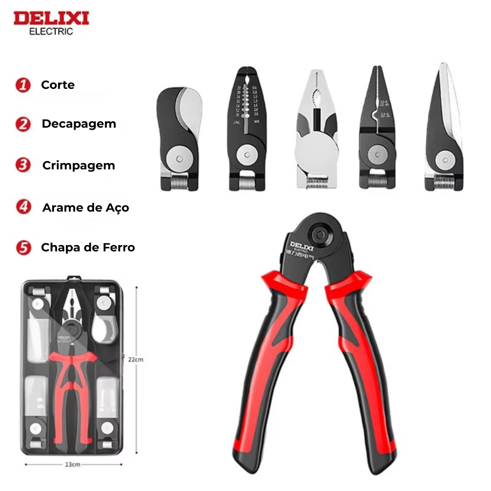 Fabricado em aço cromo-vanádio de alta resistência, o Alicate Multifuncional DELIXI 5 em 1 reúne cinco ferramentas essenciais em uma única peça: corte de fios, decapagem, crimpagem, tesoura de chapa e cortador de cabos.